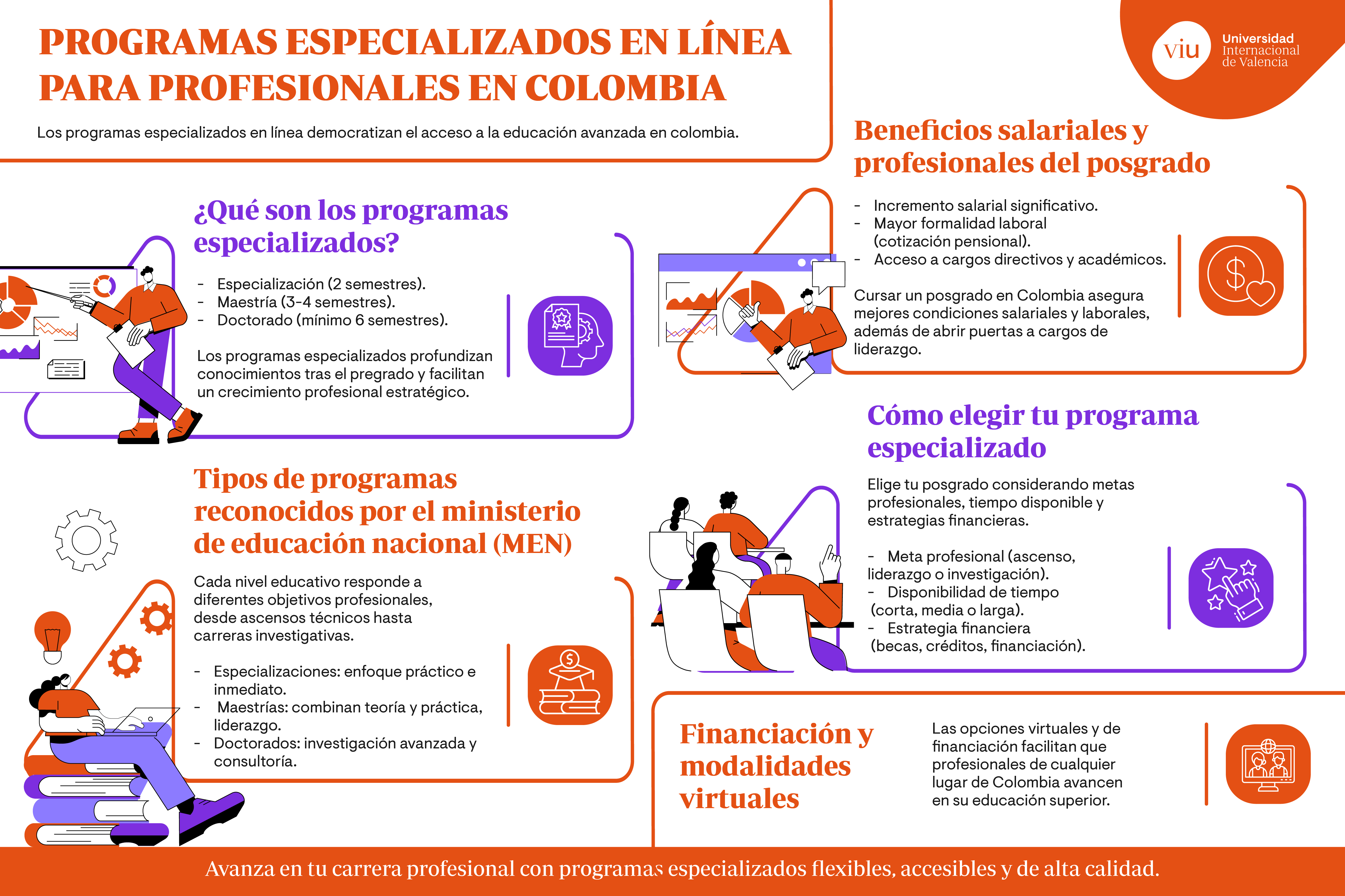 Los programas especializados en Colombia se cursan después de la formación de pregrado. Esta última abarca los programas técnicos, tecnológicos y profesionales universitarios cursados tras el bachillerato. El título obtenido habilita el desempeño inicial en el mercado laboral, pero, sobre todo, otorga el acceso a la educación de posgrado. En esta etapa posterior al grado se incluyen especializaciones, maestrías y doctorados para adquirir conocimiento y pensamiento avanzado. Las características clave de los programas especializados en la educación superior son: