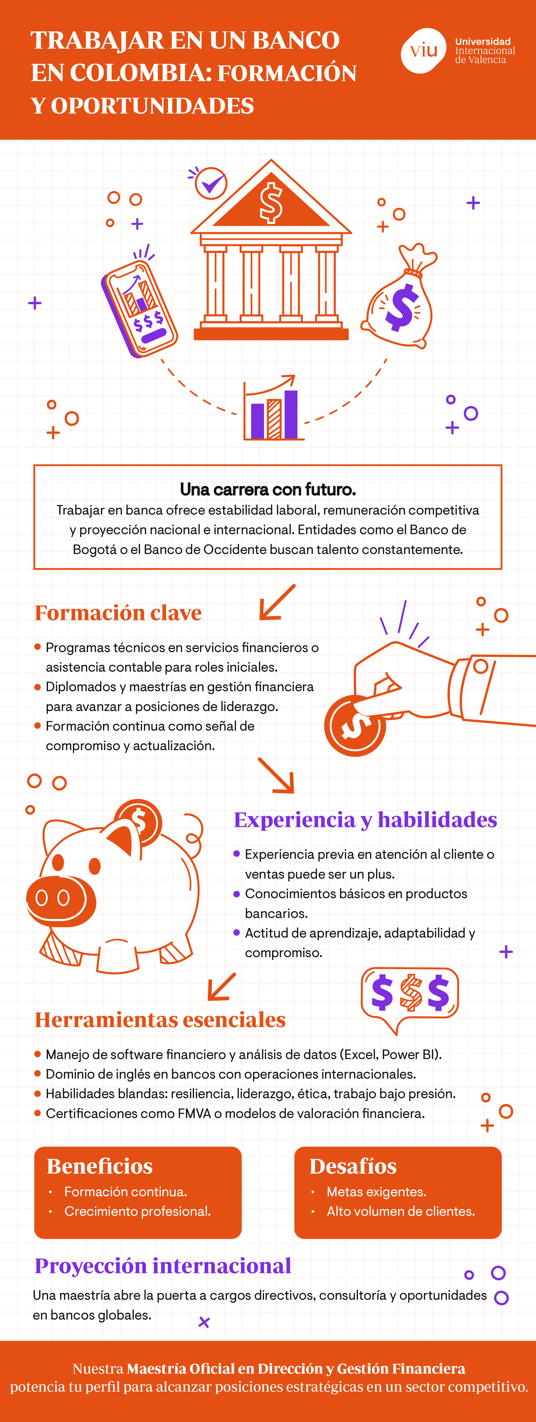 En definitiva, trabajar en un banco en Colombia es un objetivo que puedes alcanzar si cuentas con la formación y las habilidades requeridas, aunadas a una actitud orientada al aprendizaje y la innovación. Los estudios en áreas económico-administrativas, el dominio de herramientas digitales, del idioma inglés y la búsqueda constante de actualización académica son fundamentales para destacar en este competitivo sector. Una maestría en finanzas o gestión financiera en la Universidad Internacional de Valencia abre puertas en los niveles directivos y proyecta el perfil del profesional colombiano hacia el contexto global. La preparación es el camino hacia una carrera sólida en la banca y está a tu alcance con educación superior a distancia.