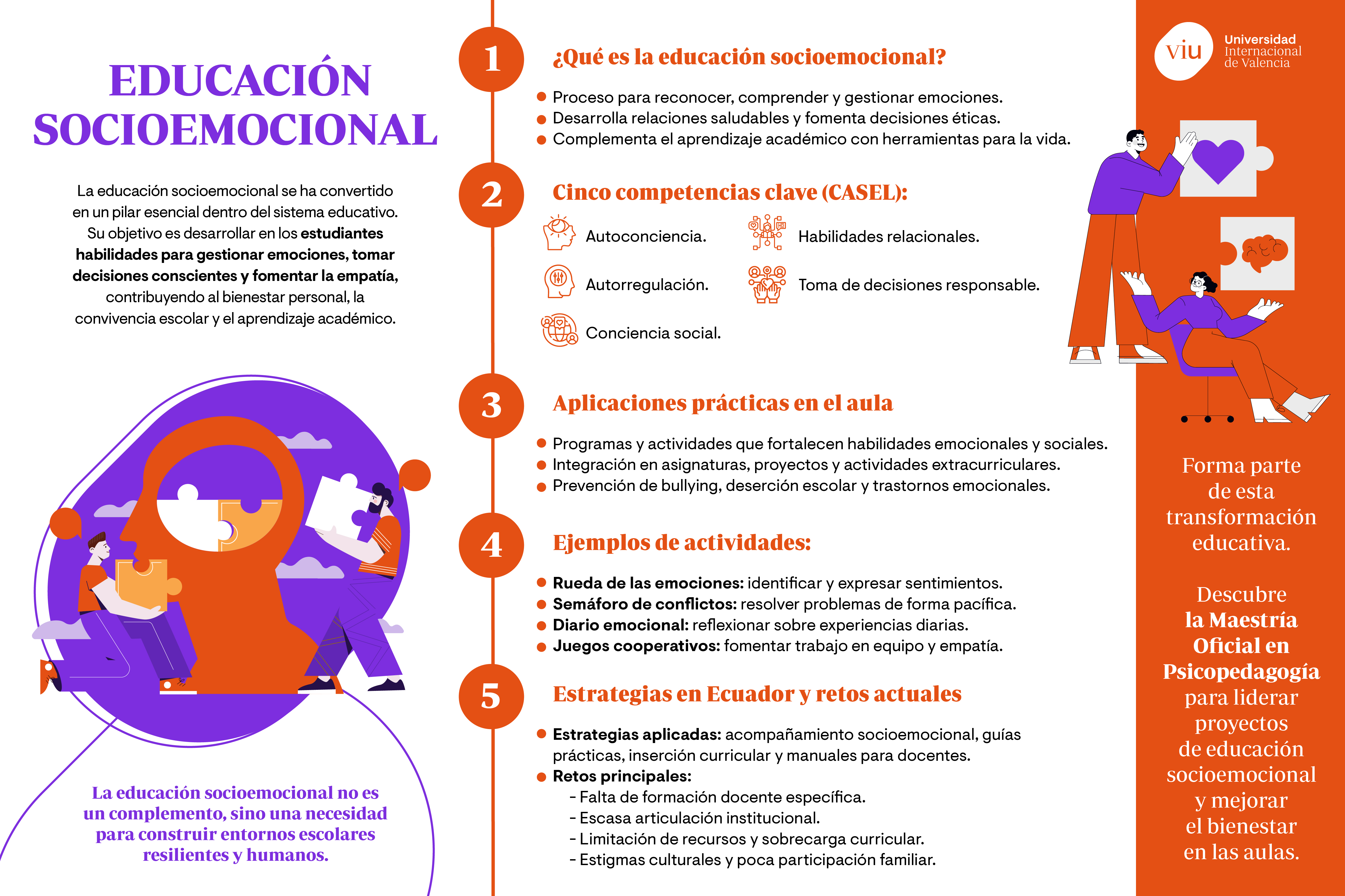 En conclusión, la educación socioemocional se ha consolidado como un componente esencial en la formación integral de los individuos. Desde una sólida base teórica que abarca la psicología del desarrollo y la pedagogía humanista, hasta su implementación en contextos escolares y comunitarios. Sin embargo, su aplicación enfrenta desafíos importantes y superarlos es vital para construir entornos educativos más humanos y resilientes. Si deseas explorar más sobre este tema, te invitamos a descubrir nuestros programas especializados, como la Maestría en Psicopedagogía. La Universidad Internacional de Valencia cuenta con una amplia gama de opciones educativas que se encuentran alineadas con el sector en el que deseas especializarte.