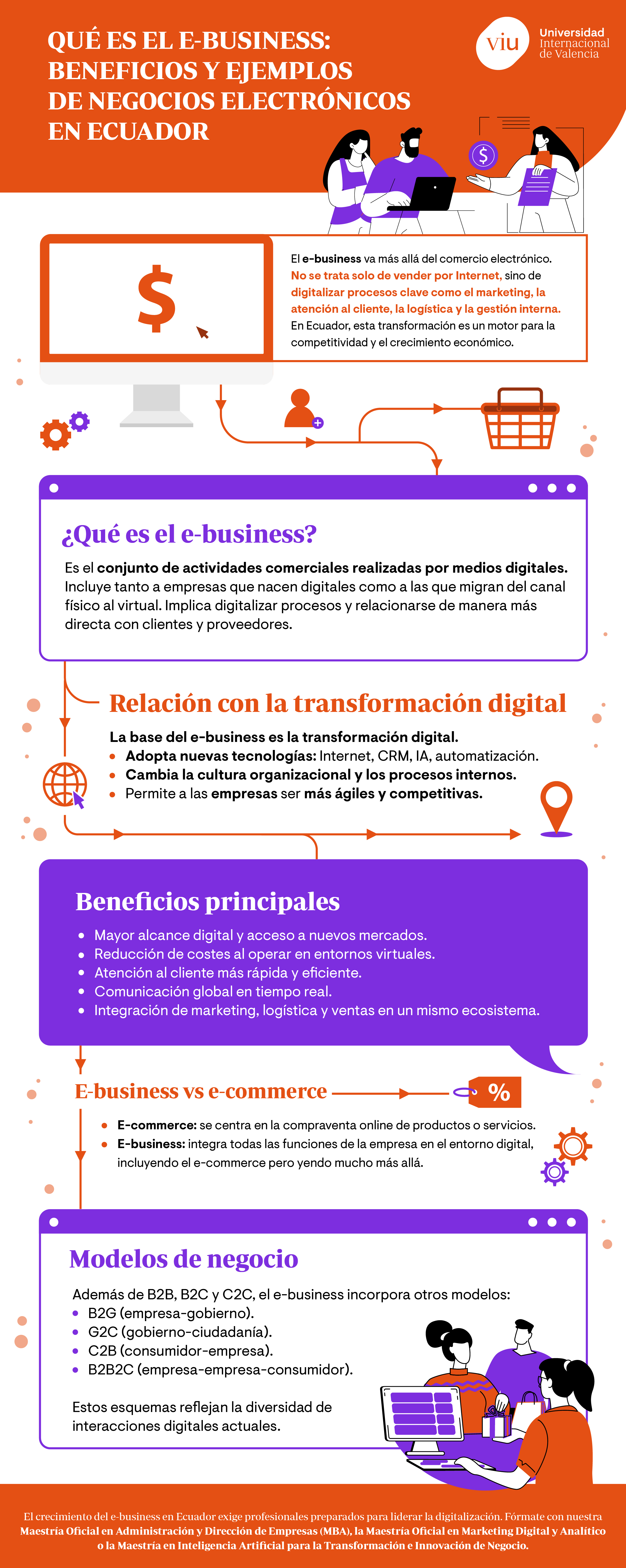 Este artículo busca ofrecer una visión completa del e-business y los negocios digitales en Ecuador , explorando sus características, diferencias con el e-commerce, beneficios, tipos de modelos de negocio y su estrecha relación con la transformación digital. Si deseas comprender a fondo este modelo de negocio electrónico y su impacto en el mercado global, este contenido es para ti. Además, conocerás oportunidades de formación especializada para destacar en este ámbito. Sigue leyendo y descubre cómo el e-business está revolucionando la manera de hacer negocios en Ecuador.