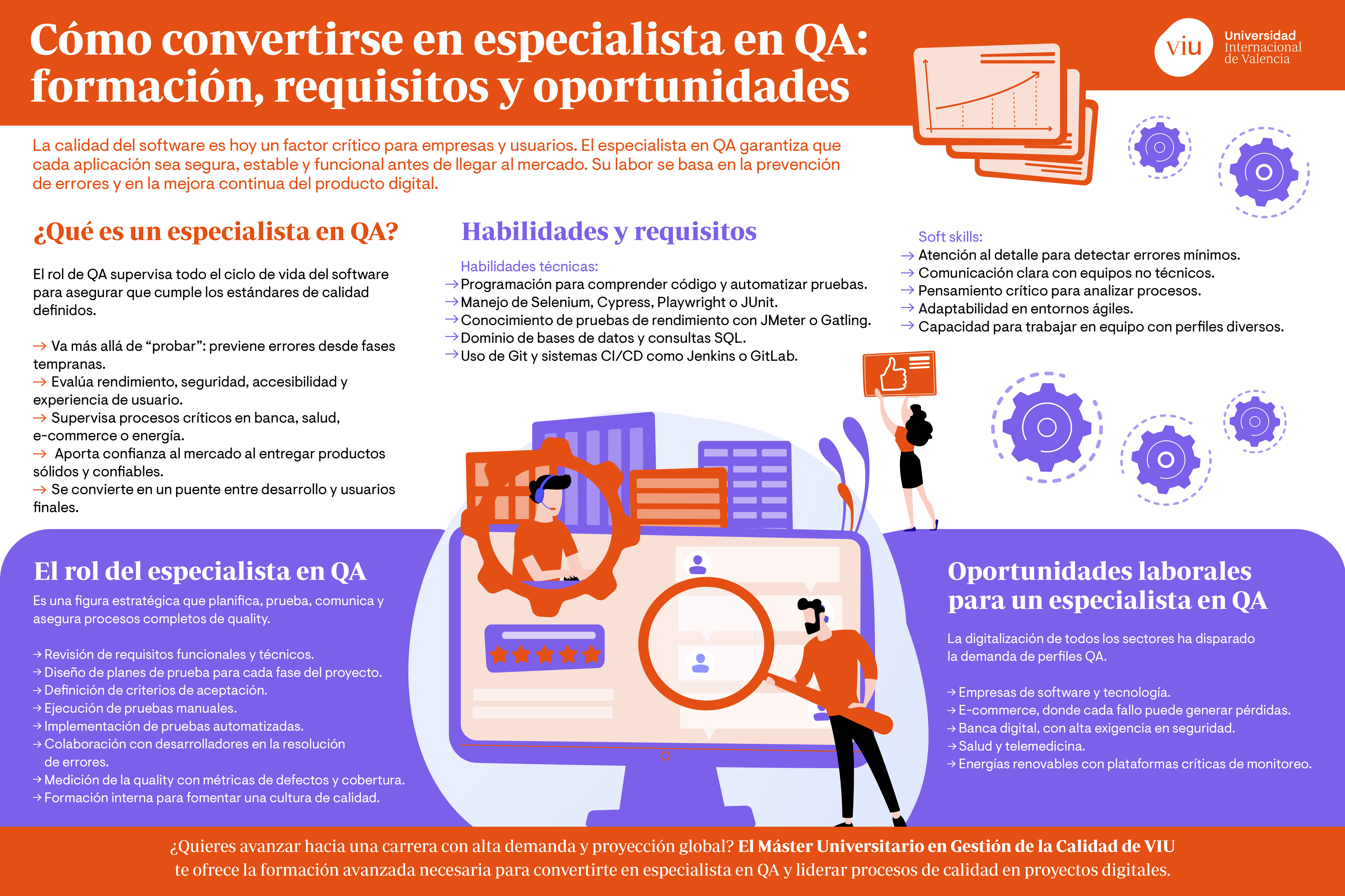 Por otra parte, realizar un máster te ayuda a construir una red profesional. Muchos programas incluyen prácticas en empresas, lo que facilita la inserción laboral de cada especialista en QA. Es el caso del Master Gestión de calidad de VIU, el cual será tu trampolín perfecto hacia este universo laboral.