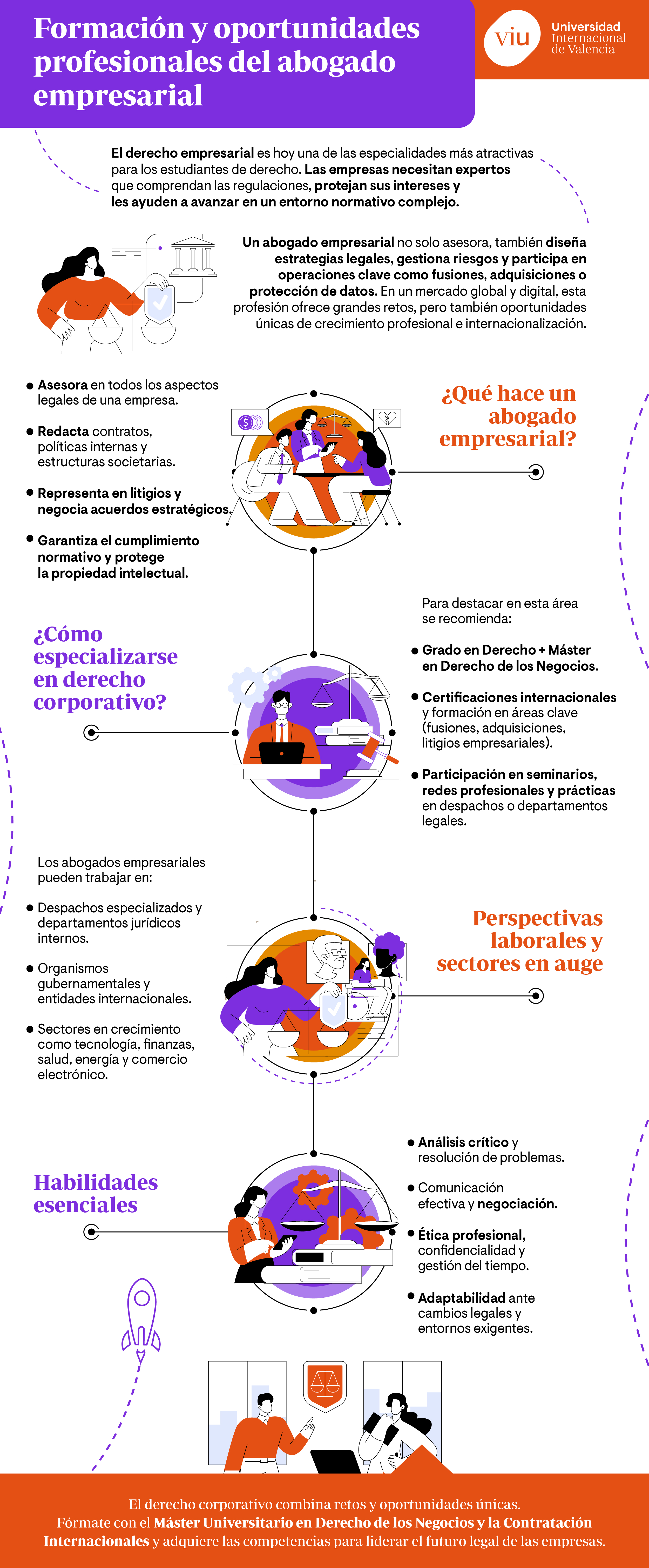 - Cursar un máster o posgrado en derecho de los negocios para obtener una formación específica en aspectos legales relacionados con las empresas. El Máster en Derecho de los negocios de VIU es, posiblemente, la mejor alternativa.