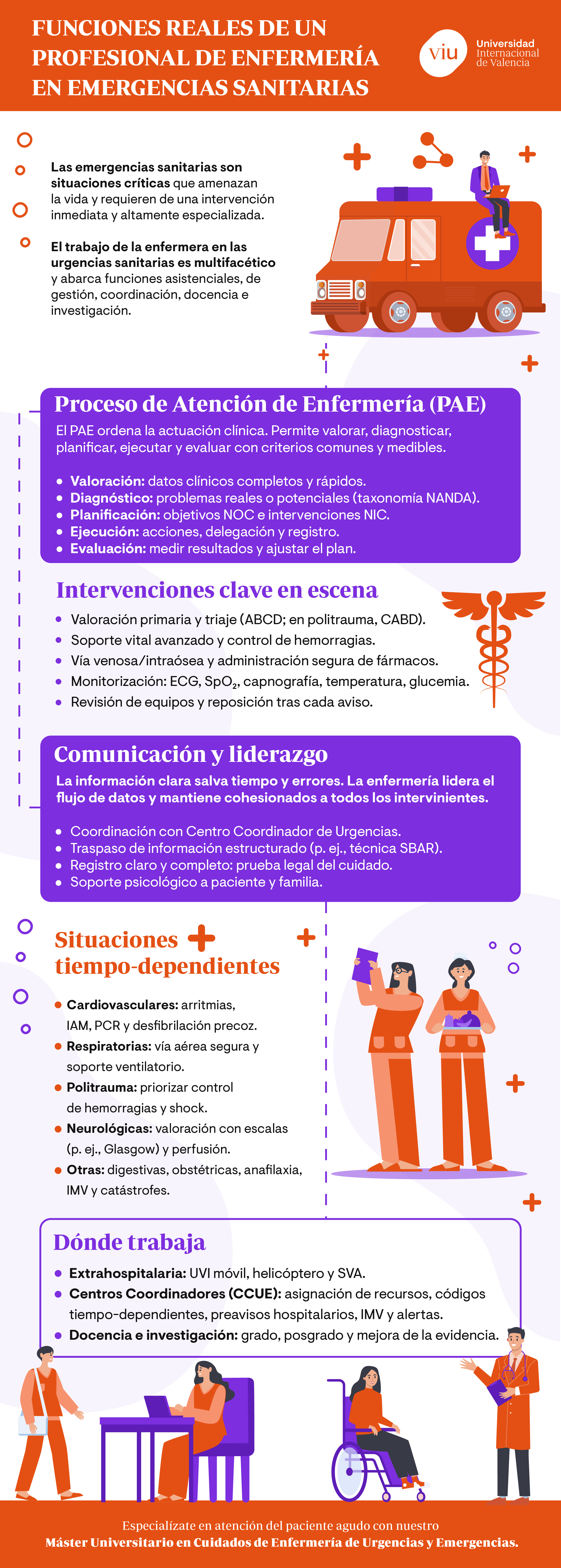 Este artículo describe el rol de las enfermeras y enfermeros (en adelante, enfermeras, englobando ambos términos) en las emergencias sanitarias. Su actuación combina conocimientos técnicos avanzados, toma de decisiones bajo presión y habilidades comunicativas dentro de un proceso de atención estandarizado denominado Proceso de Atención de enfermería (PAE de enfermería).