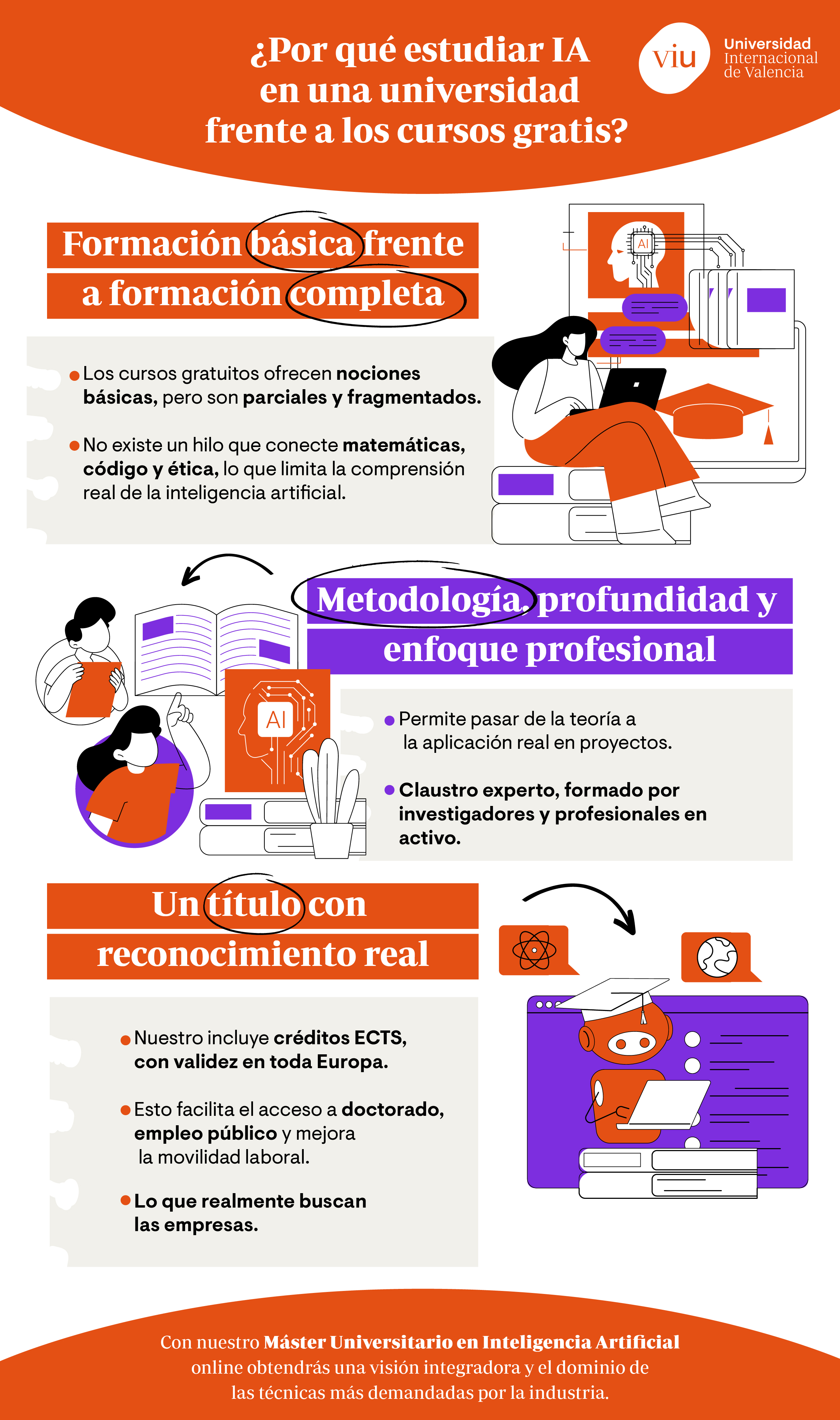 La diferencia entre estudiar un máster en IA online o cursos gratis radica en la calidad y la empleabilidad. Aunque los cursos gratuitos ofrecen nociones básicas, la universidad proporciona créditos ECTS, un claustro experto y una profundidad técnica vital para liderar proyectos de alto impacto. Con el Máster oficial en IA online de VIU pasas de la teoría a la práctica y obtienes la capacitación que demandan las empresas tecnológicas. ¡Conviértete en uno de los perfiles capaces de gestionar arquitecturas de datos complejas y modelos predictivos avanzados!