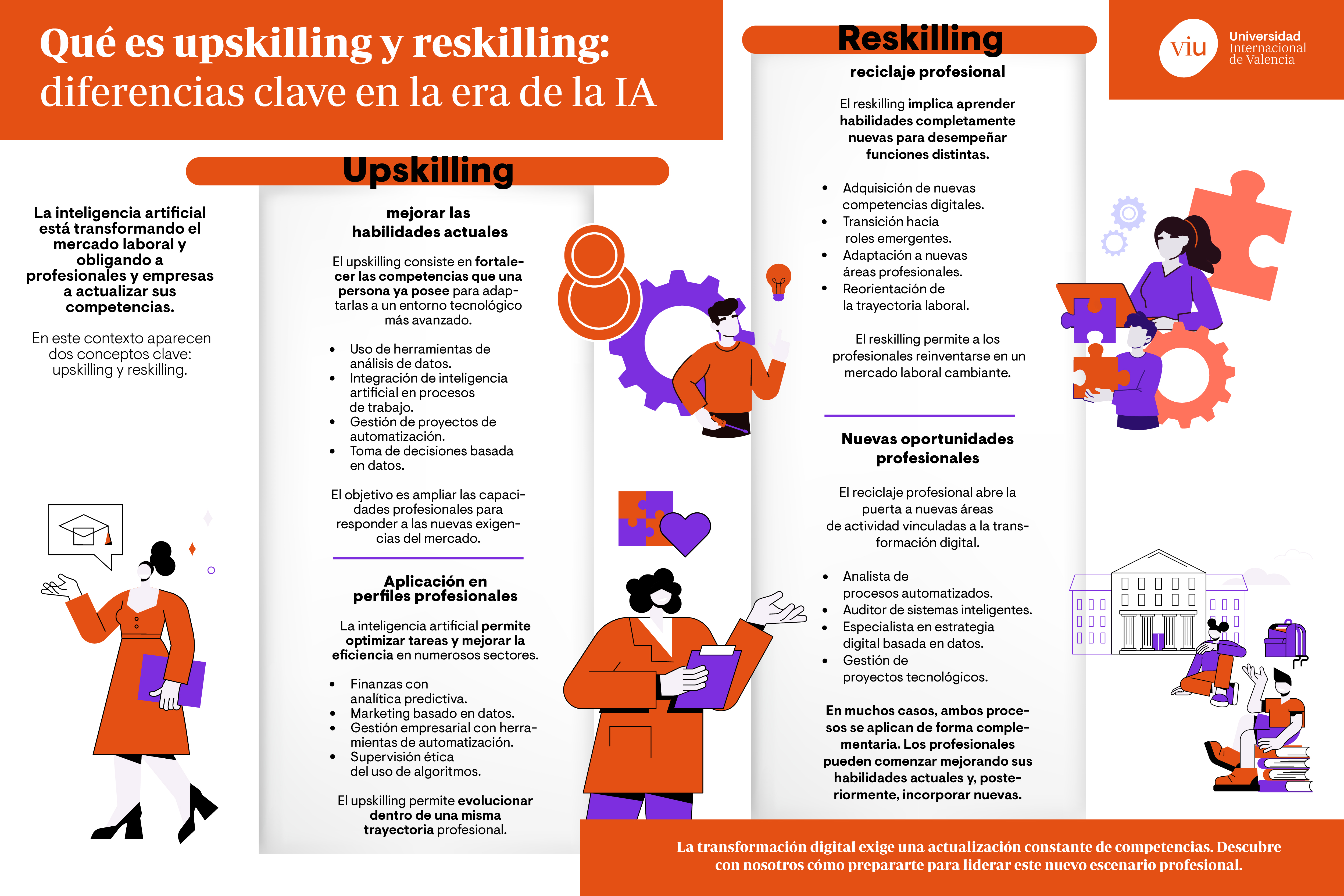El upskilling mejora las competencias existentes dentro del mismo rol. El reskilling implica adquirir habilidades nuevas para cambiar de función o área profesional. Ambos forman parte de las estrategias de adaptación ante la automatización.