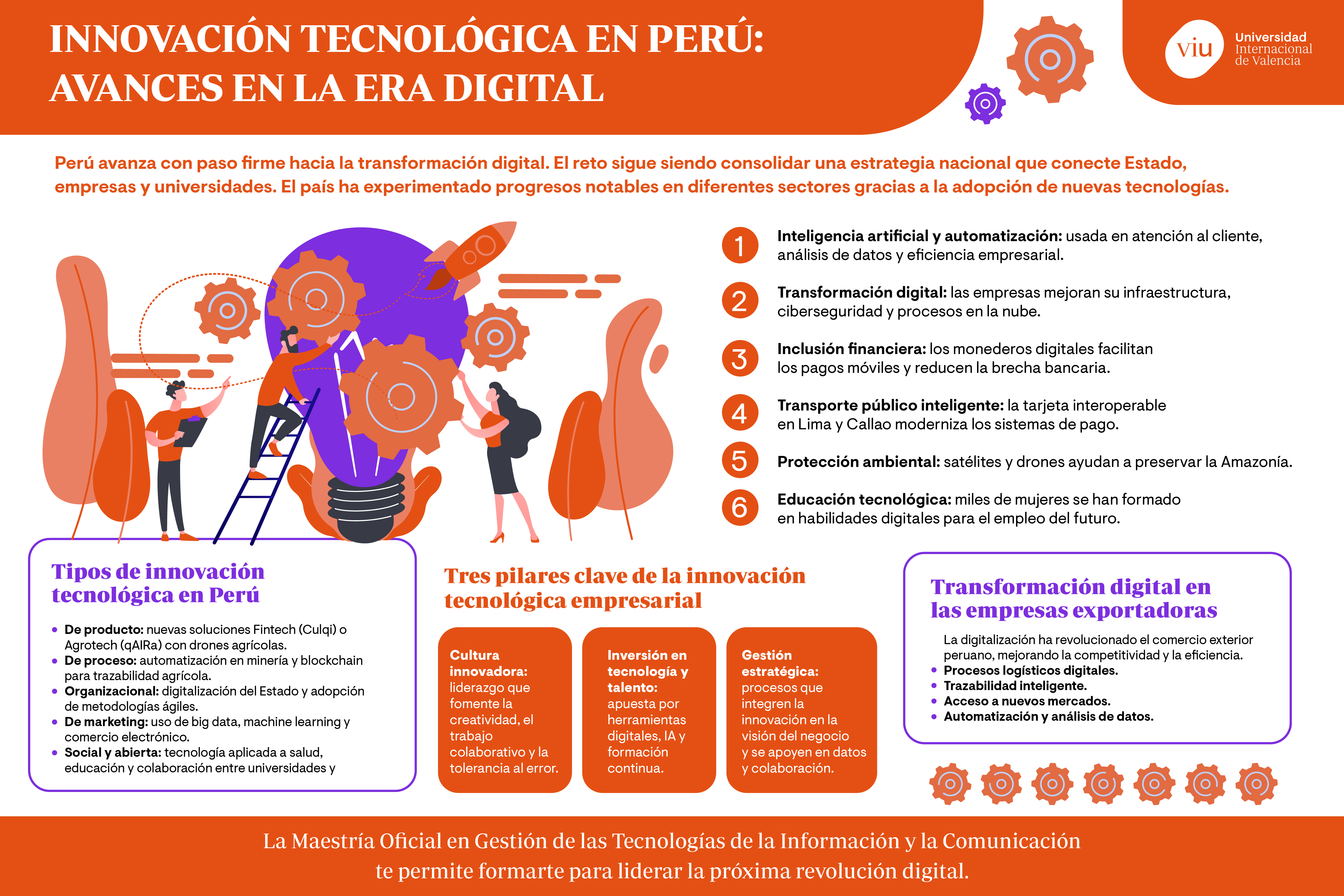 En conclusión, Perú ha dado pasos importantes hacia la innovación tecnológica con un ecosistema emprendedor en crecimiento y mayor apoyo institucional. El país tiene la oportunidad de convertirse en un líder regional en innovación si prioriza este enfoque de manera estratégica. Si deseas explorar más sobre este tema, te invitamos a descubrir los programas especializados que VIU ofrece, como la Maestría en Tecnologías de la Información. Solicita información a nuestro equipo de asesores y fórmate para lidiar con la innovación tecnológica del país.