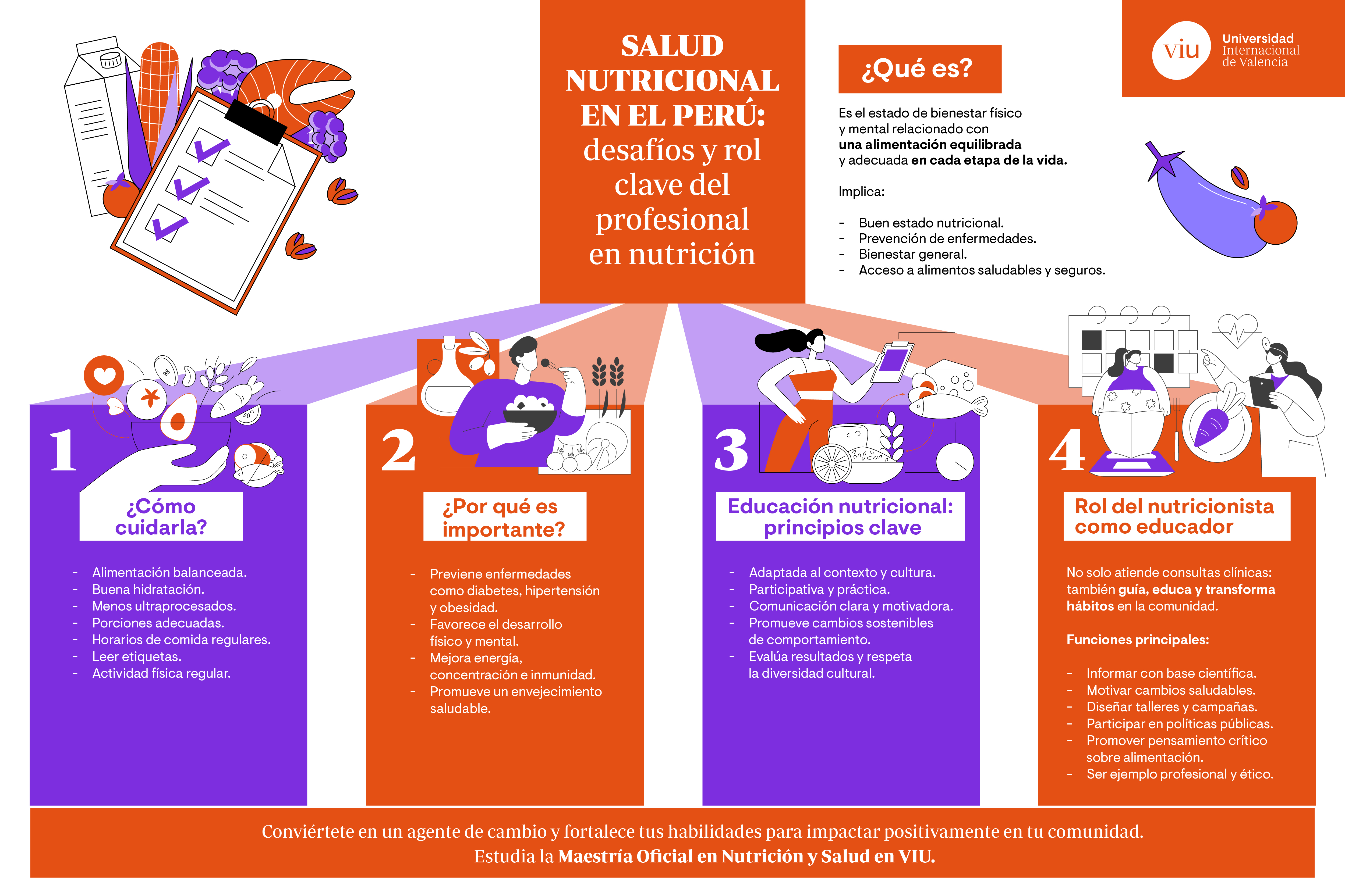 En conclusión, la salud nutricional del Perú requiere un enfoque integral y sostenido, donde la labor del profesional en nutrición sea reconocida como esencial. Fomentar la educación nutricional, especialmente desde edades tempranas, es una inversión en el bienestar y el futuro del país. Por esta razón, si deseas explorar más sobre este tema, te invitamos a descubrir los programas especializados que VIU ofrece, como la Maestría Oficial en Nutrición y Salud. Cada programa que ofrece la Universidad Internacional de Valencia, en este ámbito crucial, ayuda a reforzar las habilidades profesionales.